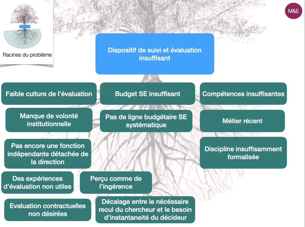 Un exemple de cause est une faible culture de l’évaluation dans cette institution. Pourquoi ? Par manque de volonté institutionnelle. Pourquoi ? Car l’évaluation est perçue comme de l’ingérence au niveau des instances dirigeantes. Ou encore car les expériences précédentes d’évaluation se sont avérées décevantes.