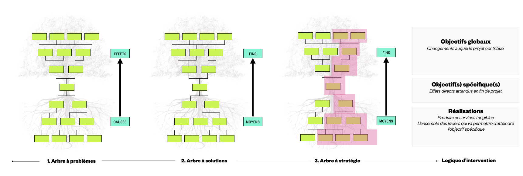 A partir de l’arbre à stratégie se construit automatiquement la première colonne du cadre logique : la logique d’intervention.